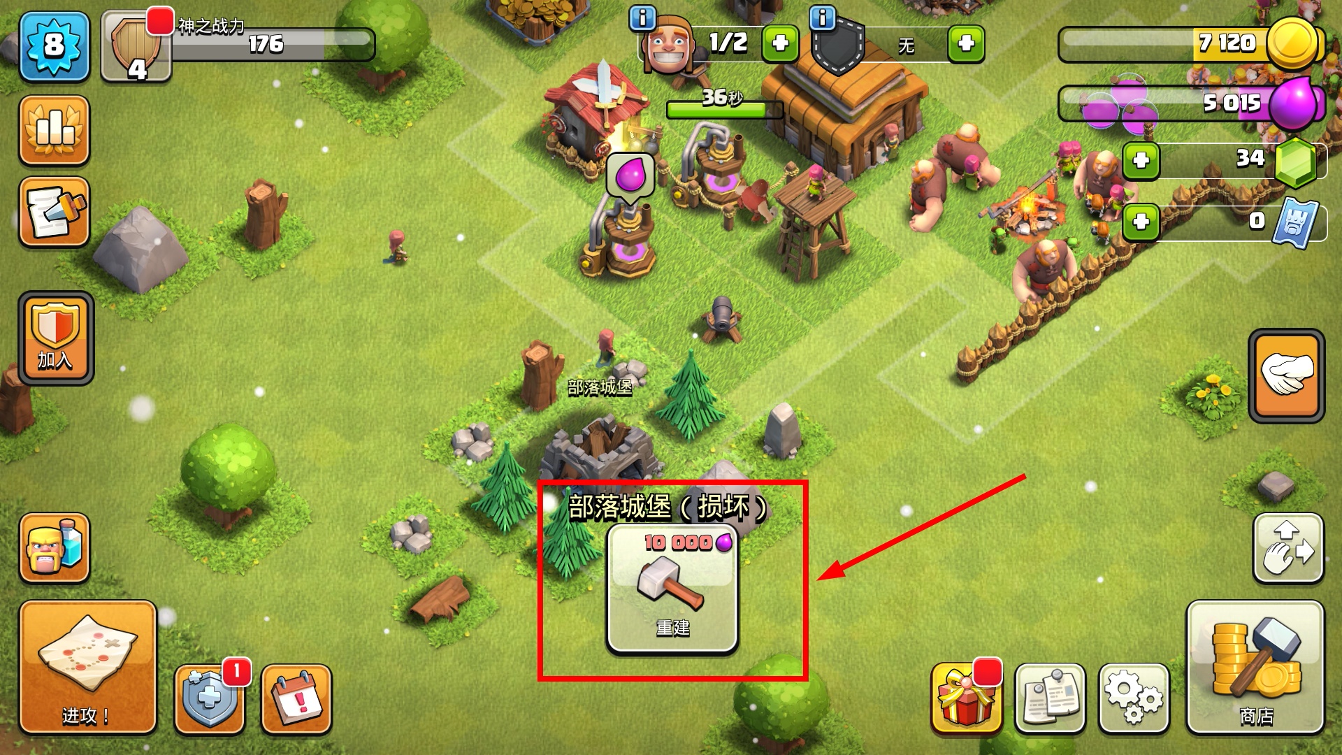 1、若基地内【部落城堡】损坏,可消耗【10000】紫宝石重建,恢复其功能以增强部落的核心防御与支援能力。