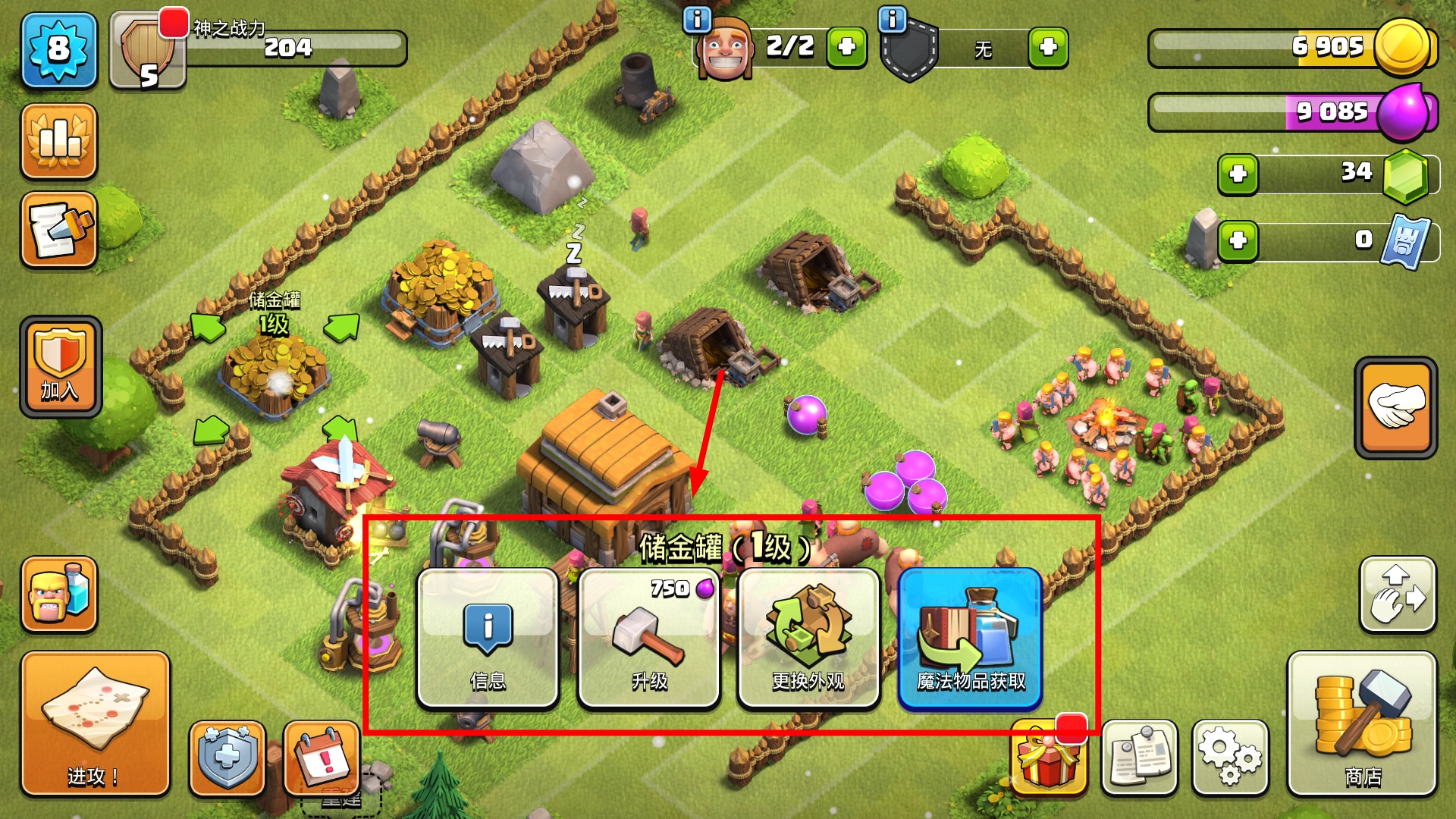 2、找到基地中的【储金罐】,点击升级选项,消耗【750】紫宝石提升等级,增加资源存储上限以支撑后续建设。