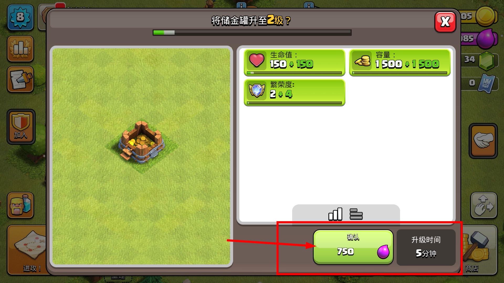 3、在升级确认界面,点击【确认】按钮消耗【750】紫宝石,等待5分钟即可完成升级,提升储金罐的容量与繁荣度。