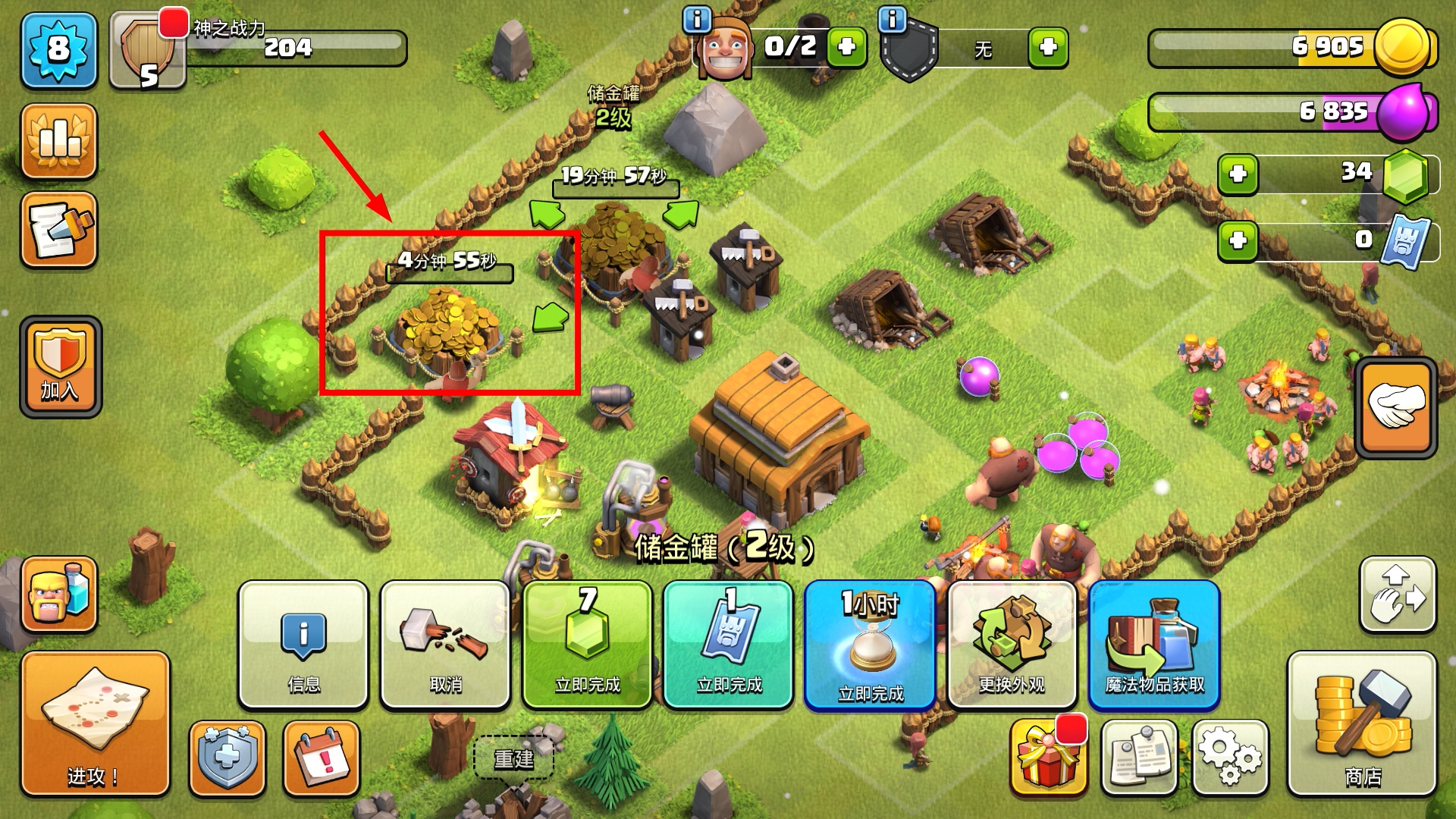 4、储金罐升级时显示剩余时间,可等待【4分钟55秒】或用道具加速,完成后能获得更高的资源存储能力。