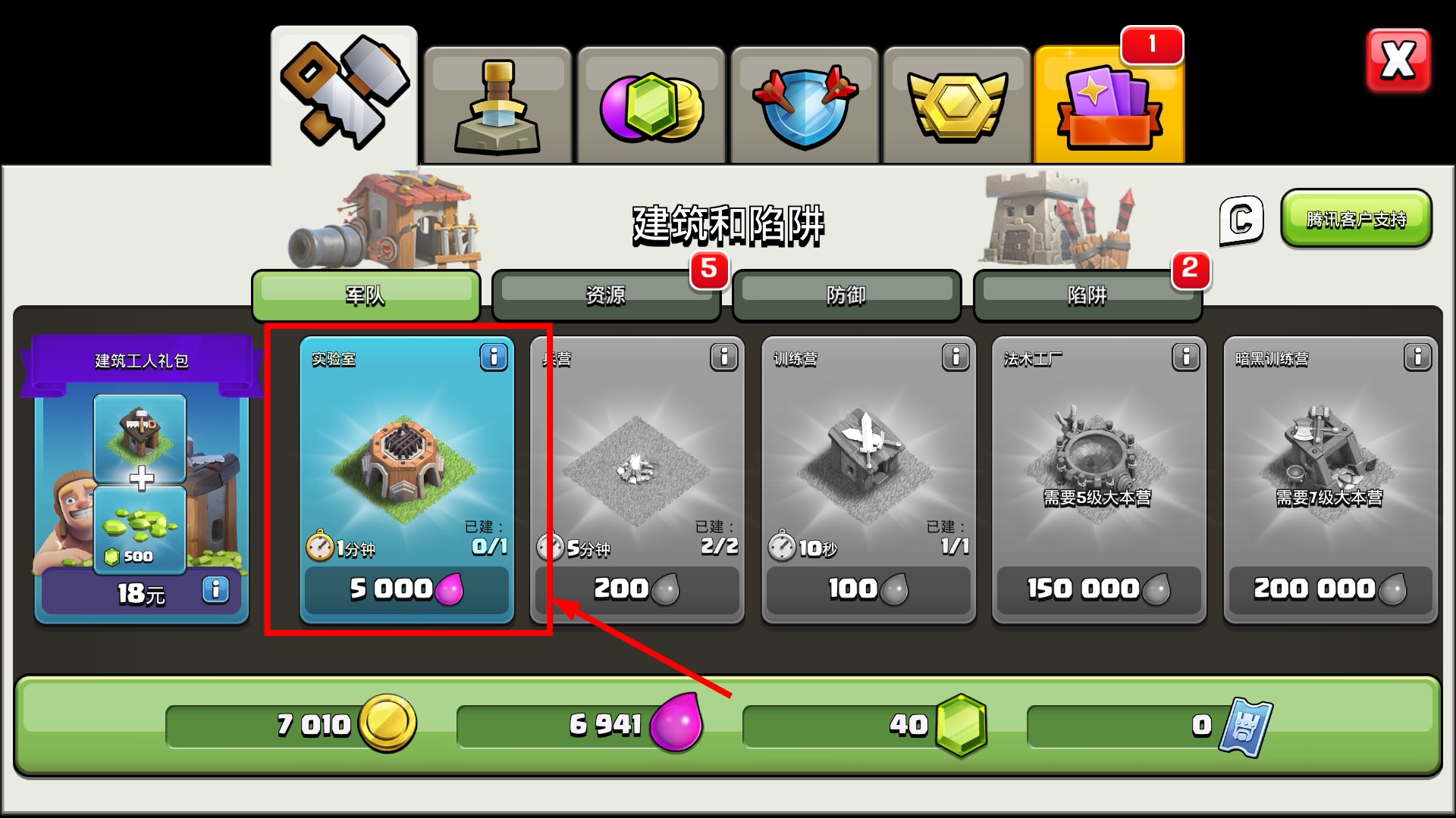 1、建造【实验室】需消耗【5000】圣水,解锁后可研究部队与法术强化,助力提升军队战斗能力。