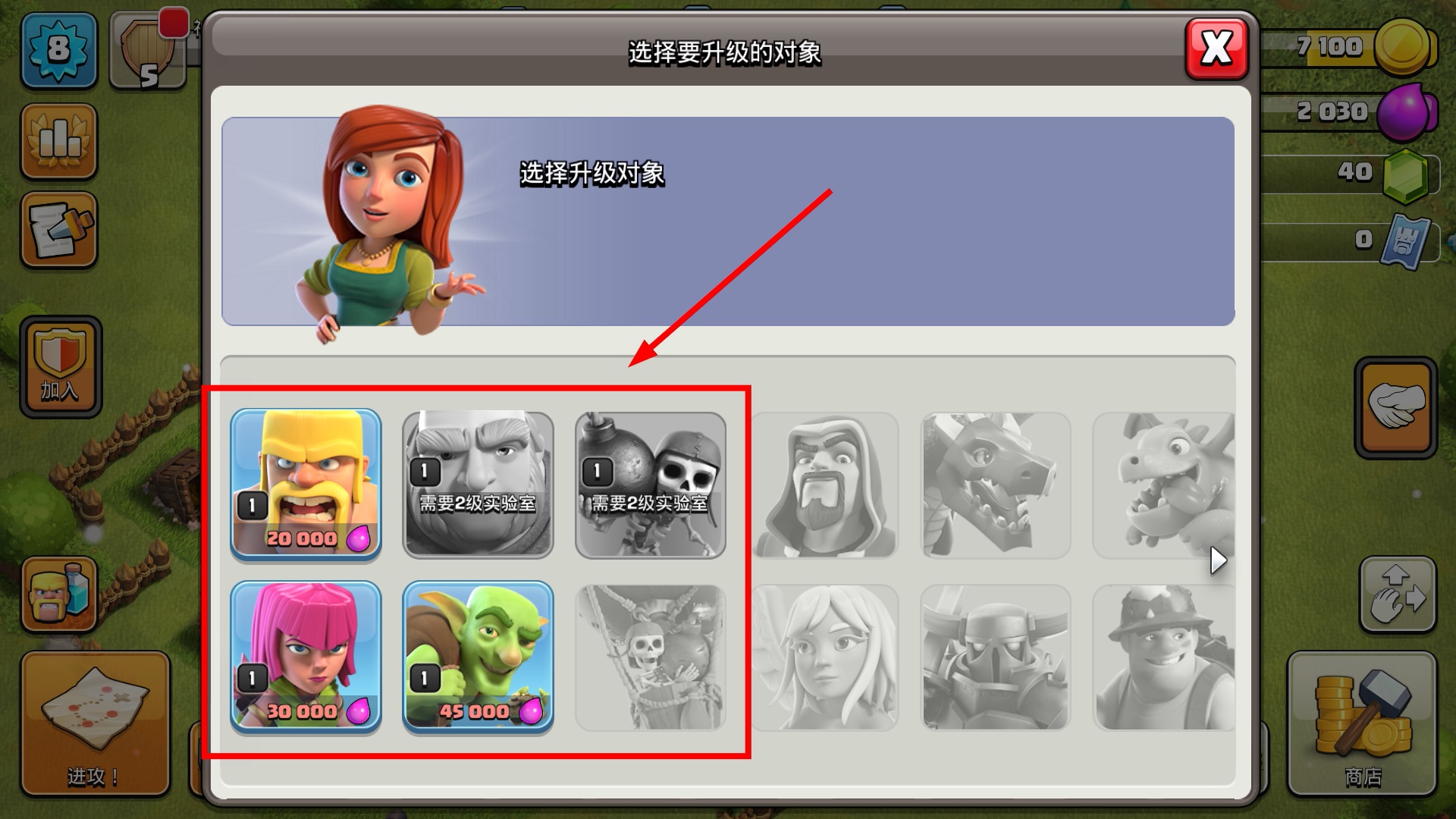 3、在升级界面选择【野蛮人】,消耗【20000】圣水即可提升等级,强化其作战属性。