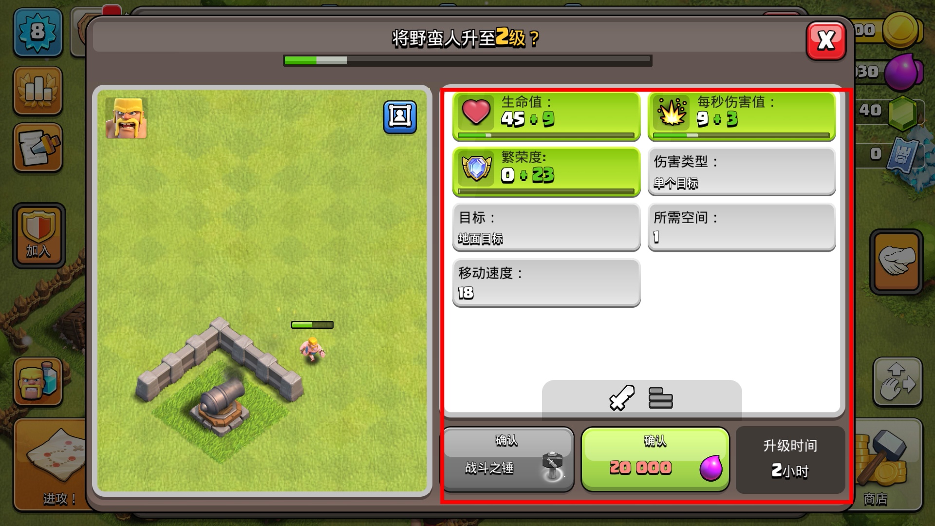 4、升级【野蛮人】后生命值为【45+9】,每秒伤害达【9+3】,确认消耗资源完成升级。