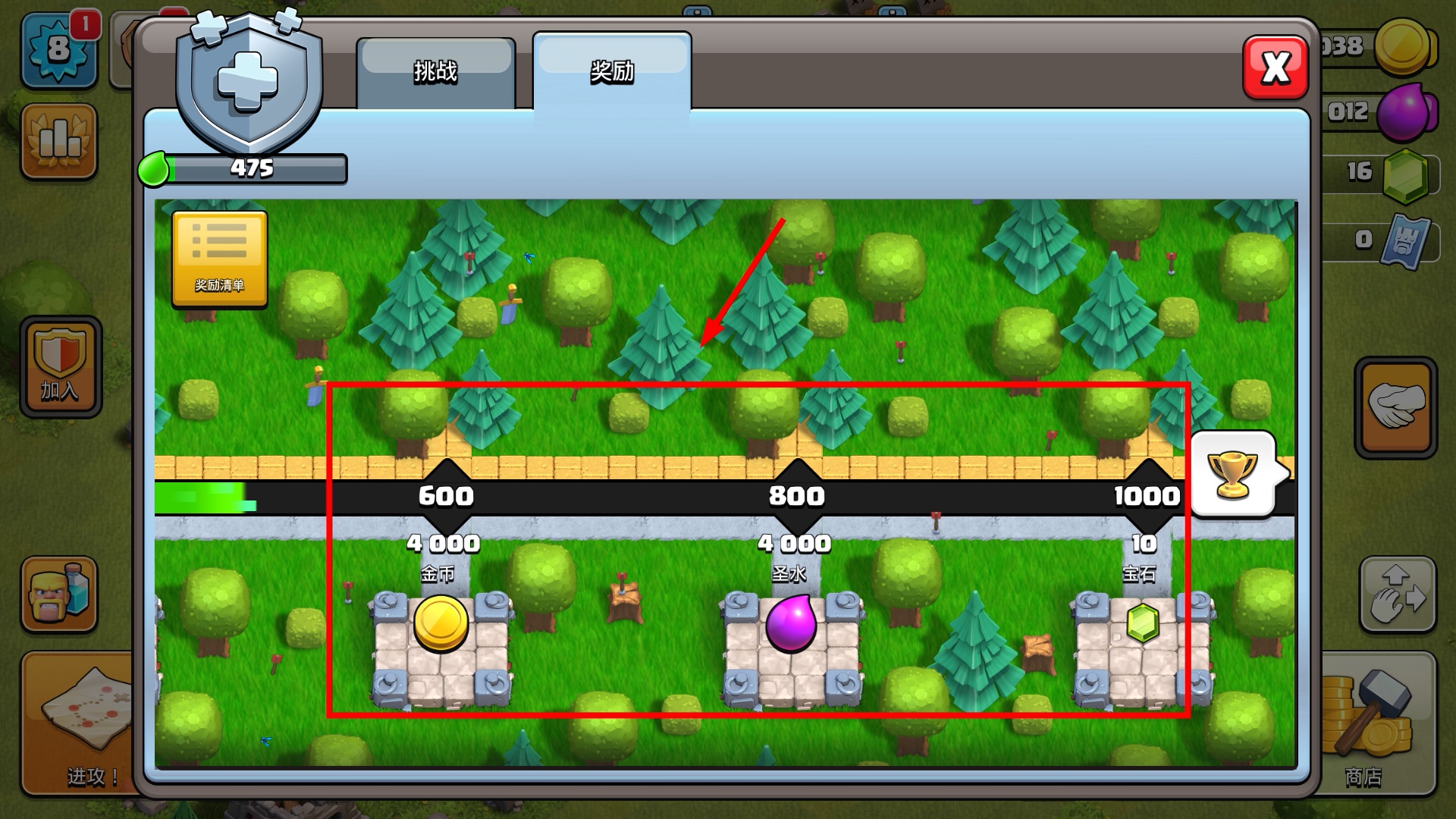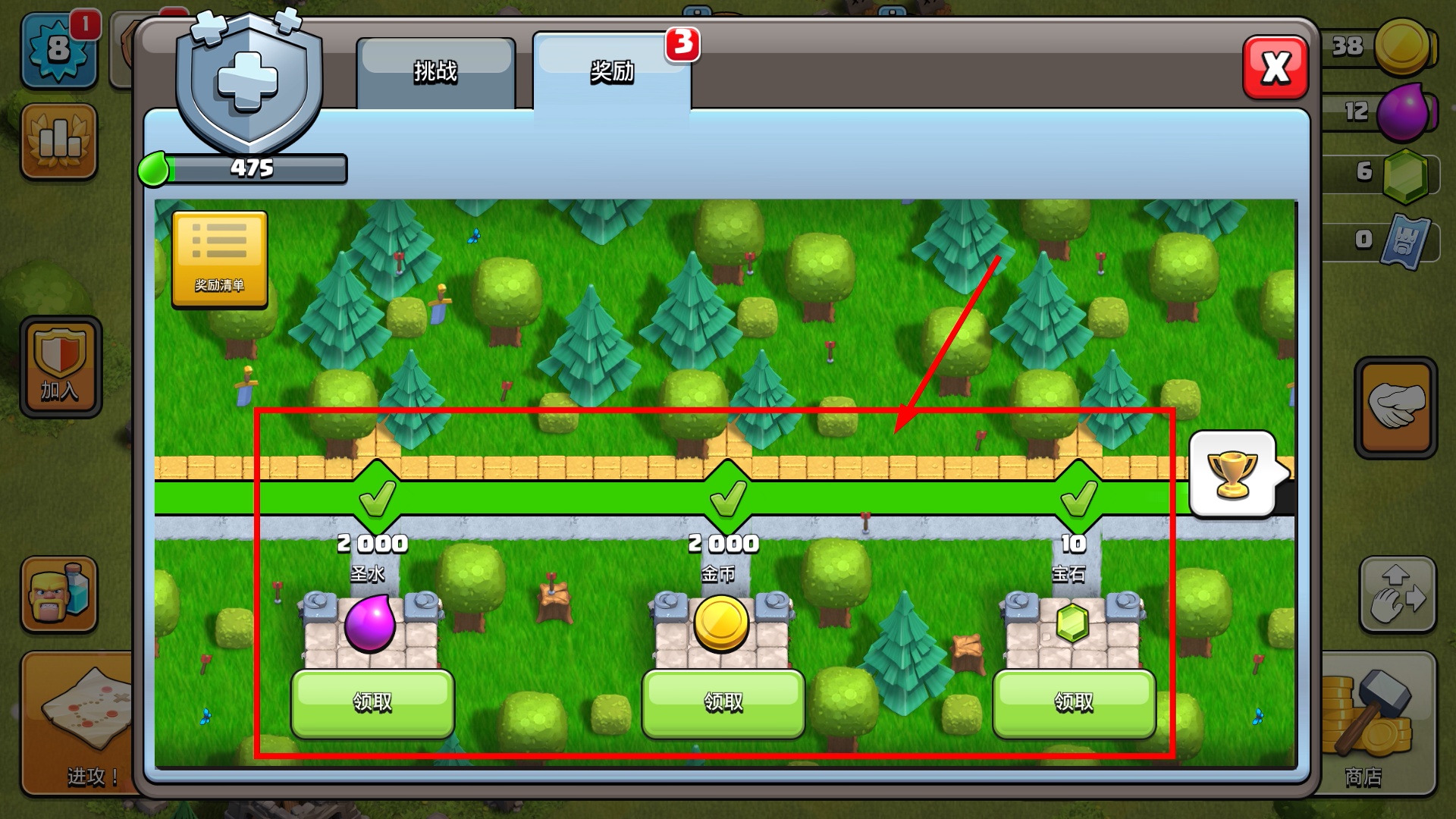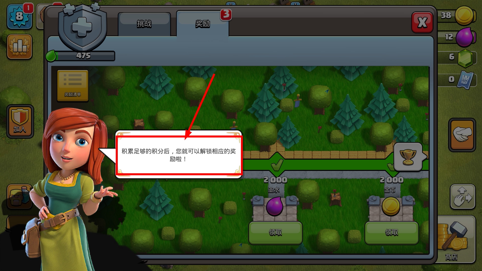 1、积累足够积分可解锁对应奖励,当前可查看【2000-圣水】【2000-金币】等奖励的领取入口。