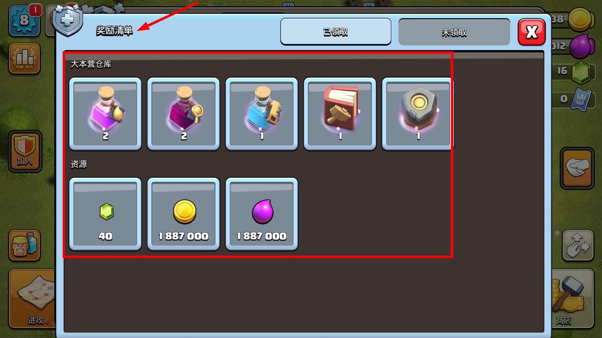 3、进入奖励清单可查看已领取的【大本营仓库-药水】【资源-金币】【资源-圣水】等道具。