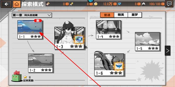 1、探索模式界面选择对应的章节关卡,点击关卡入口进入战斗场景,开启当前关卡的挑战流程。
