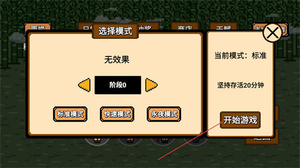 1、在选择模式界面,选标准模式,点击开始游戏,进入标准0阶模式,目标存活20分钟。
