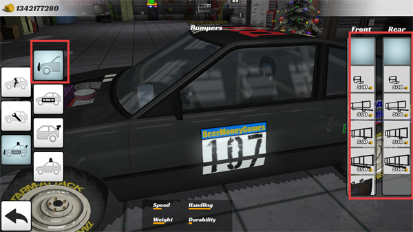 1、选择【Bumpers】模块调整前后保险杠数值,优化车辆耐用性与碰撞防护,提升比赛抗损表现。