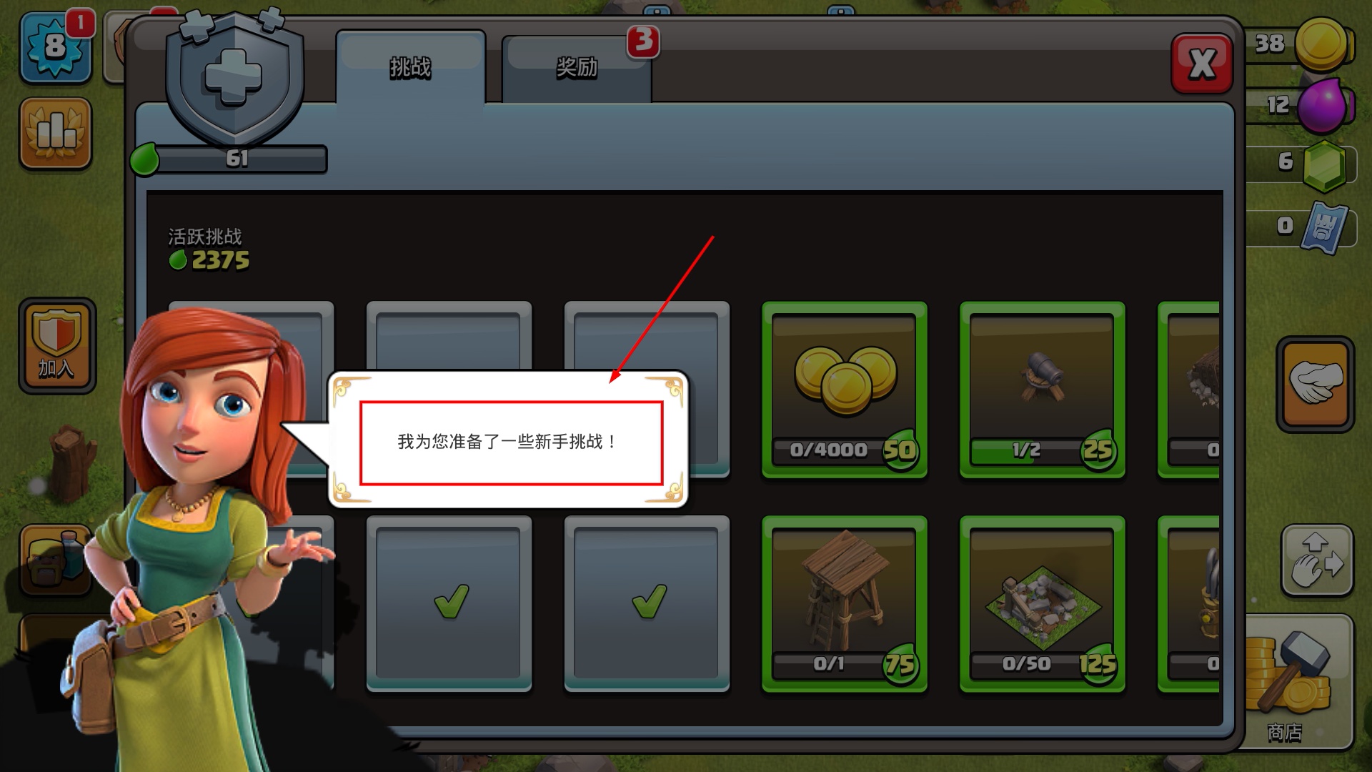 3、完成站岗放哨挑战需先去商店获取箭塔,部署后能增强基地防御,推进挑战进度。
