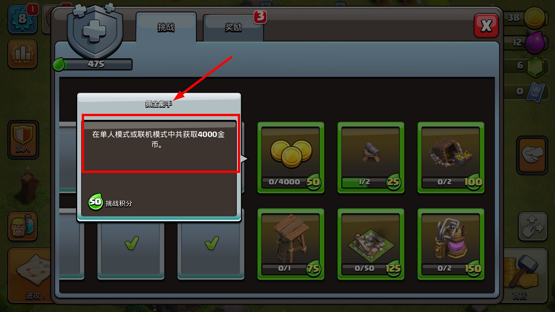 2、参与抓金能手挑战,在单人或联机模式中攒够【4000】金币,即可获得挑战积分与奖励。