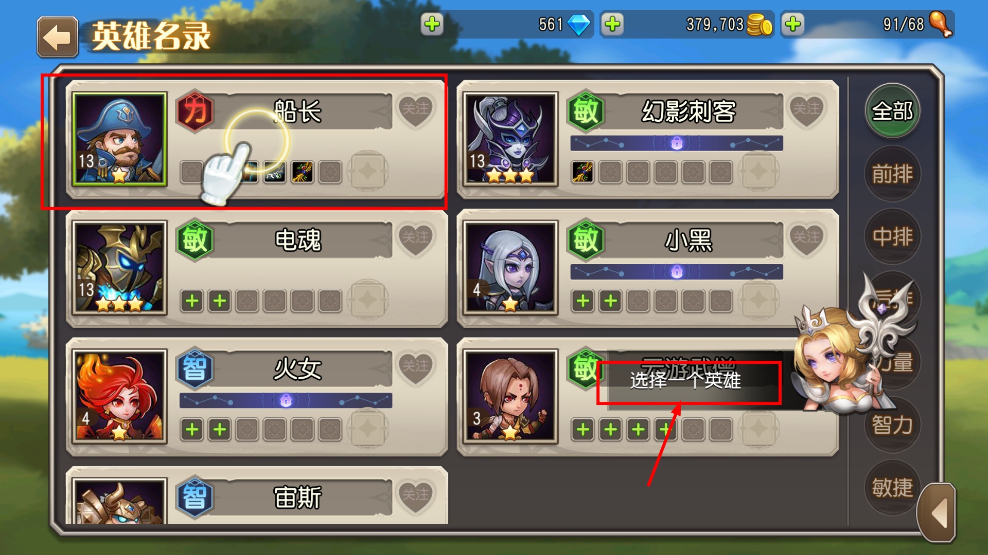 2、在英雄名录中选择【船长】,该英雄定位前排,能为队伍提供不错的生存与控制能力,适合优先培养。