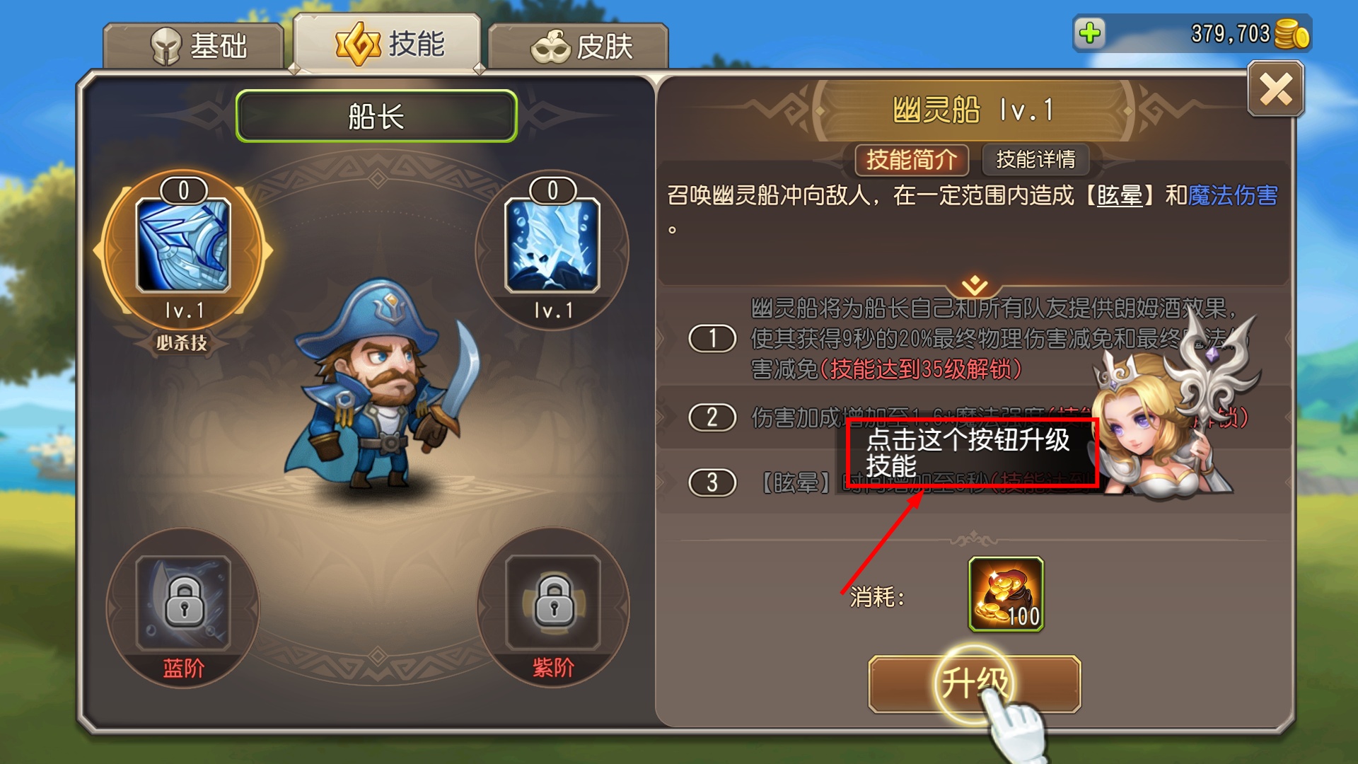 3、升级【船长】的【幽灵船】技能,消耗【金币】提升等级,解锁团队减伤效果,增强队伍续航。