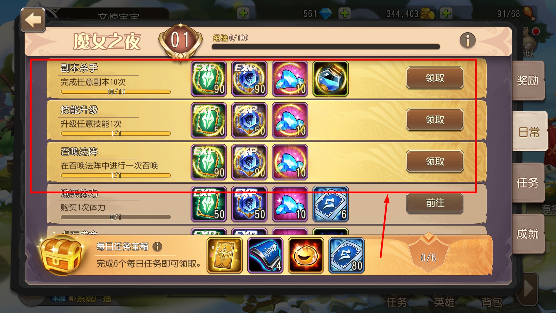 4、完成魔女之夜的【技能升级】等任务后点击领取,可获得【经验】【钻石】,加速角色成长。