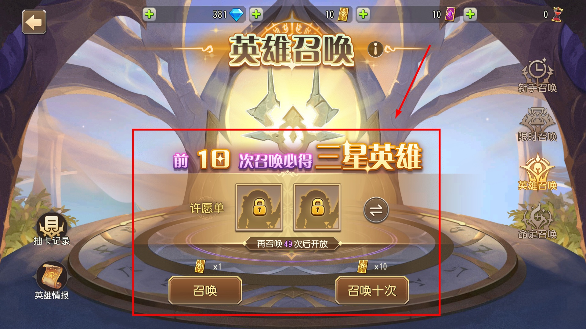 2、英雄召唤界面中,前10次召唤必得【三星英雄】,建议优先使用召唤券进行召唤以获取强力角色。