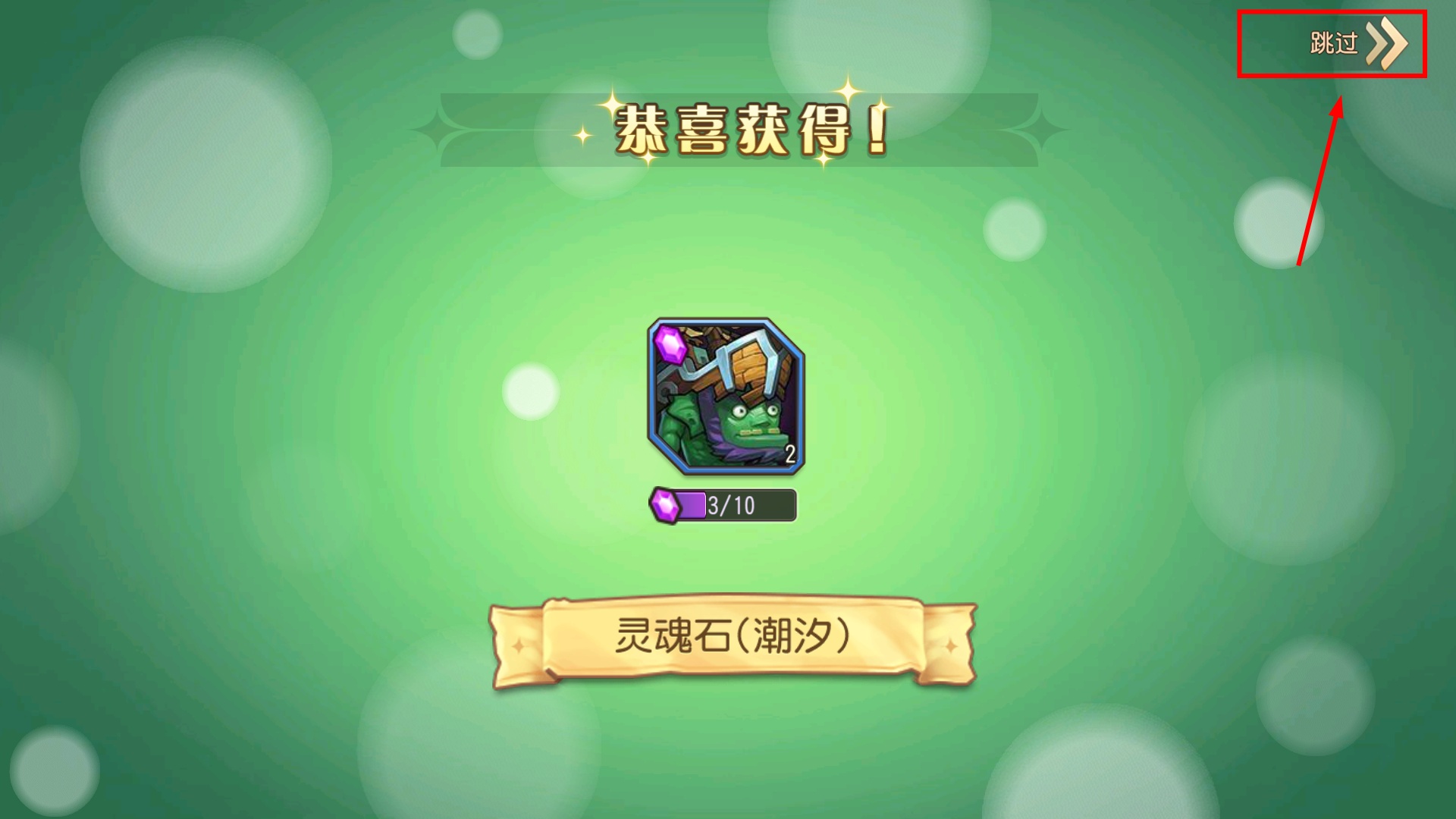 3、召唤获得【灵魂石(潮汐)】后,可点击右上角跳过按钮快速结束动画,节省操作时间提升效率。