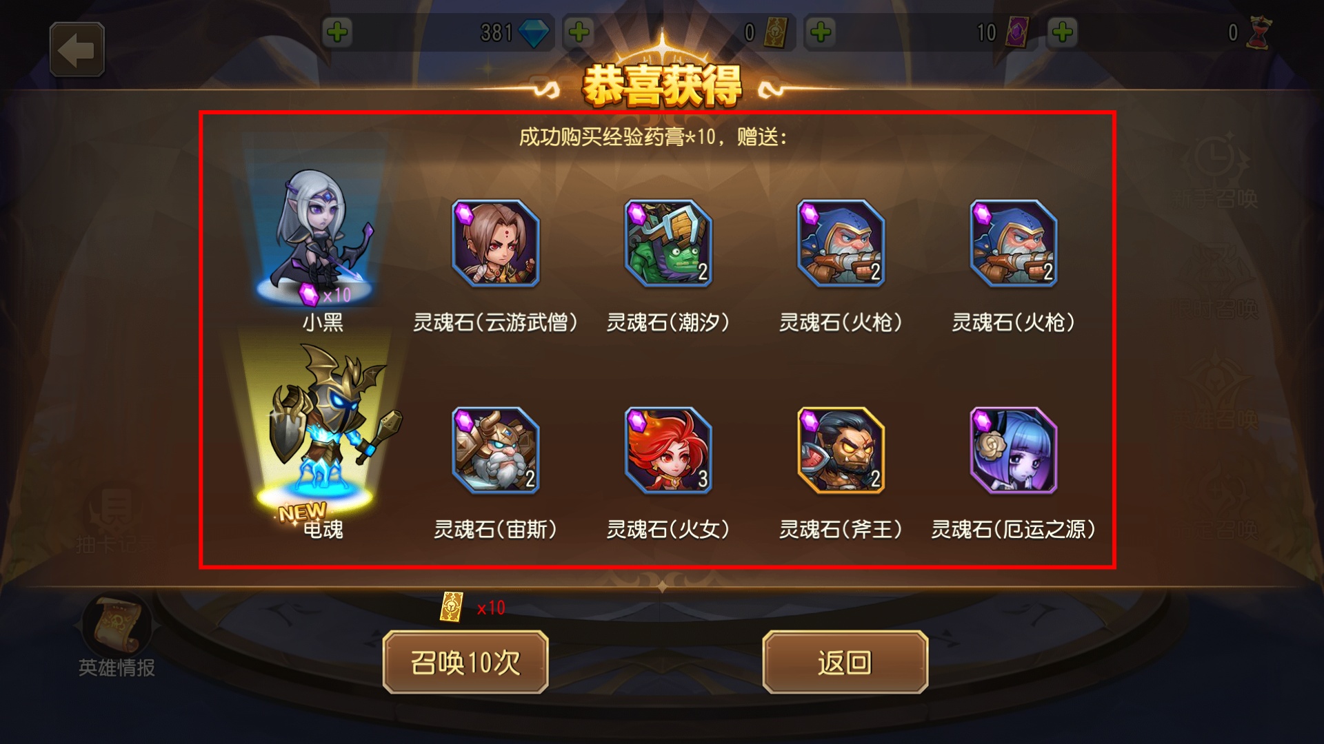 4、购买【经验药膏】可获赠多个灵魂石与新英雄【小黑】【电魂】,是快速积累英雄的有效途径。