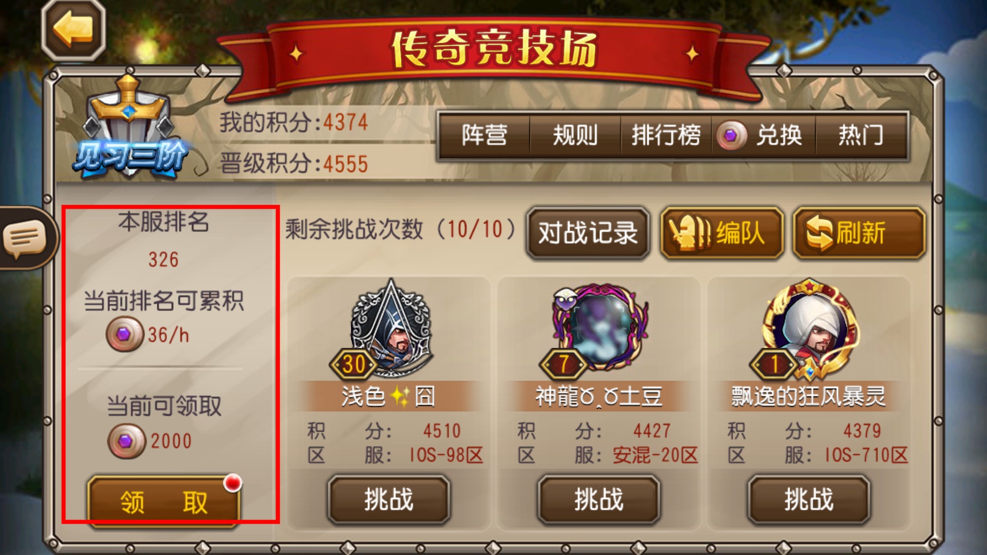 2、进入【传奇竞技场】后查看自身积分与排名,领取可获取的奖励,再选择合适对手发起挑战。