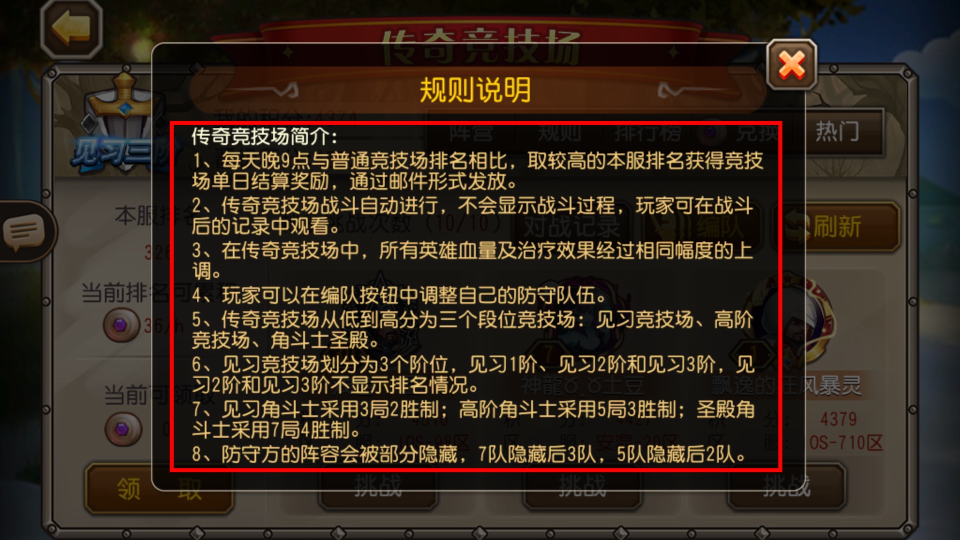 3、在【传奇竞技场】界面点击规则按钮,了解自动战斗、血量上调等规则,助力高效参与竞技。