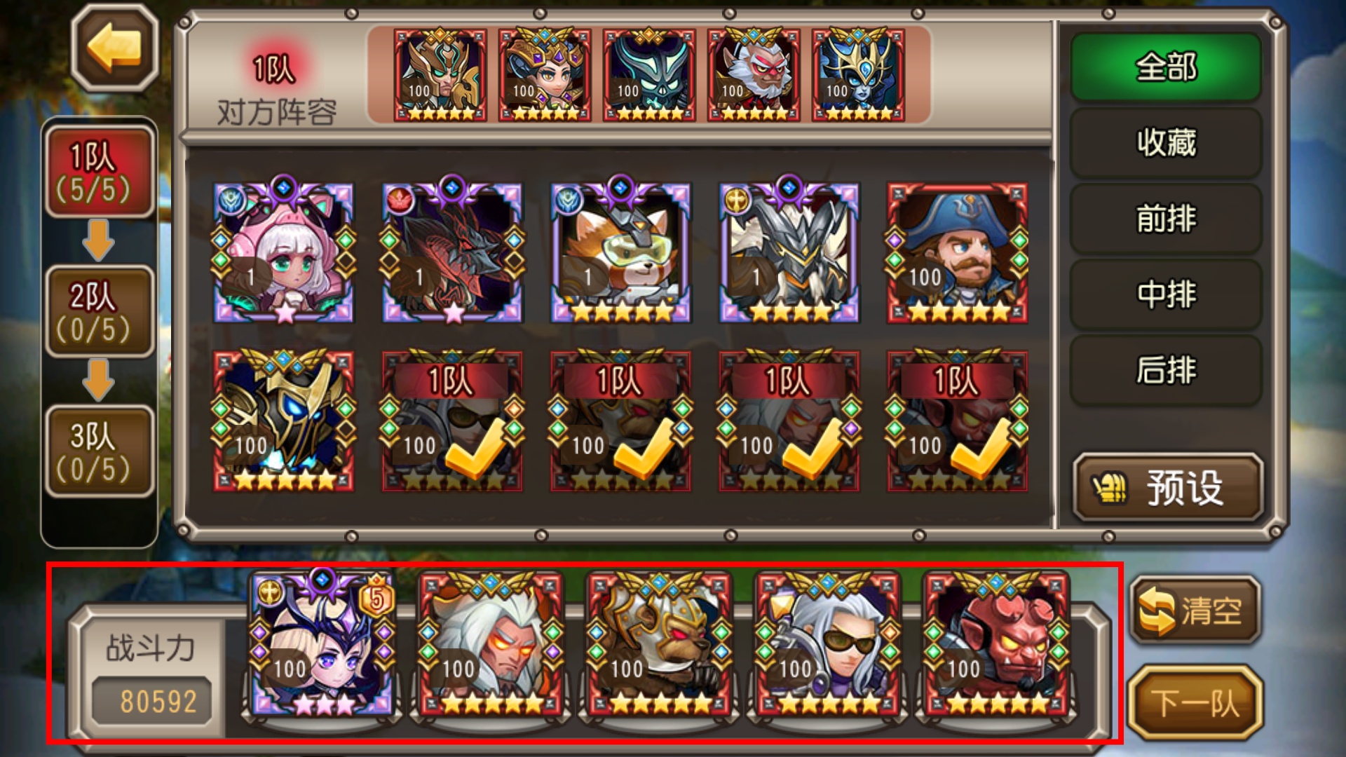 4、在编队界面调整出战队伍,查看队伍【战斗力】数值,选择合适英雄组队应对对手。