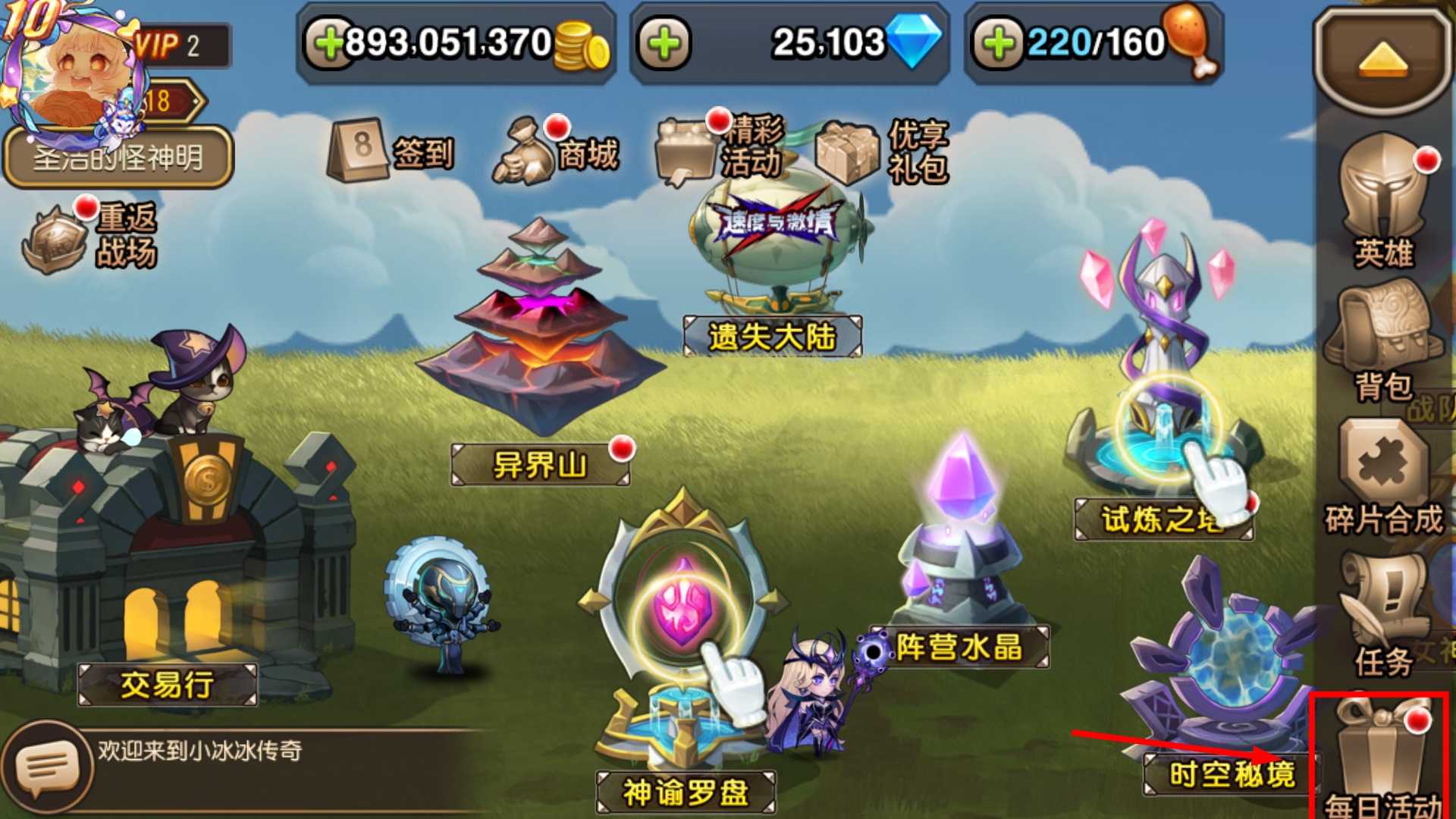 1、进入游戏主界面后,点击【每日活动】图标,可参与日常任务获取各类游戏奖励。