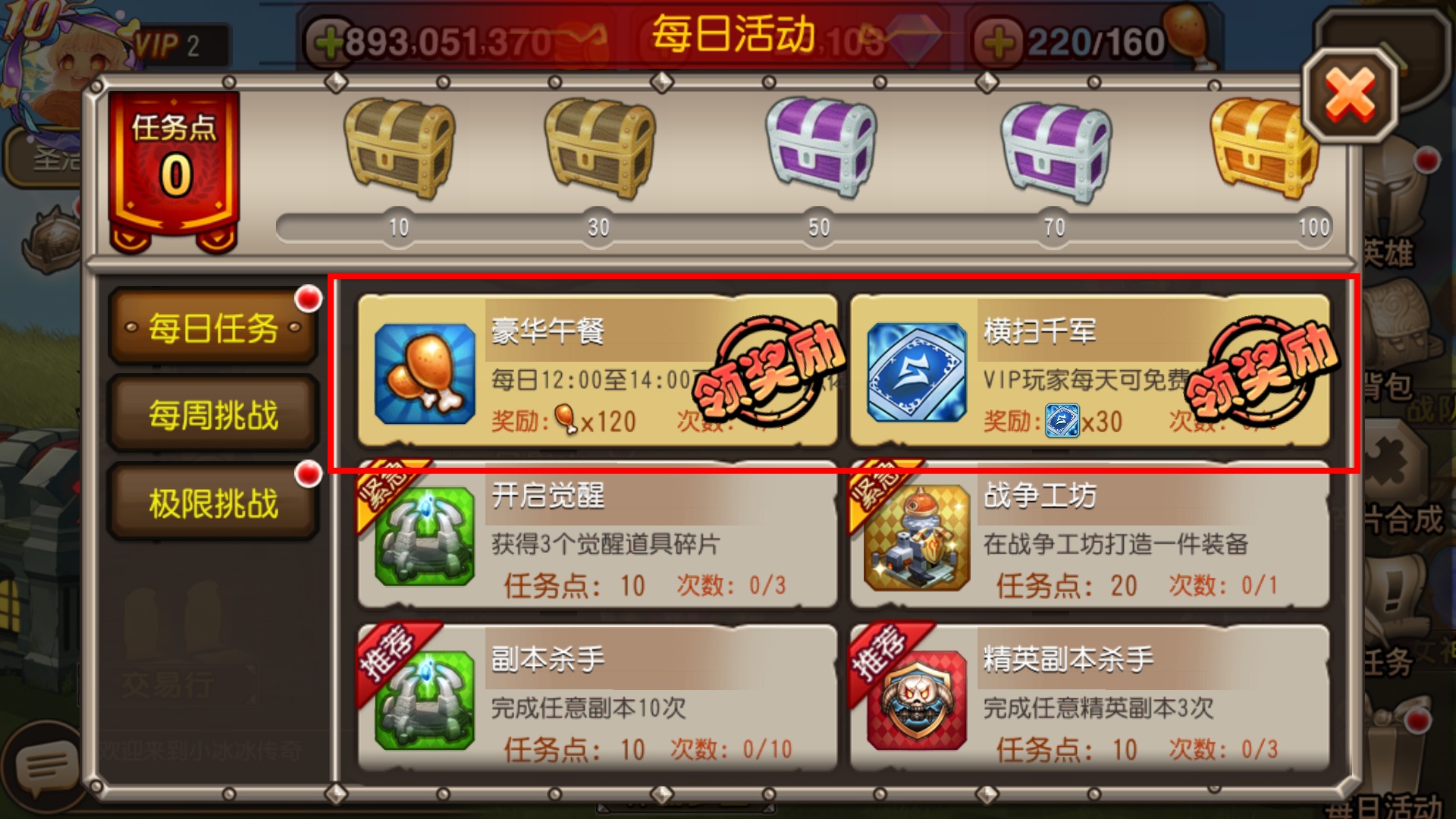 2、在每日活动界面,点击【豪华午餐】和【横扫千军】的领奖励按钮,领取对应道具。