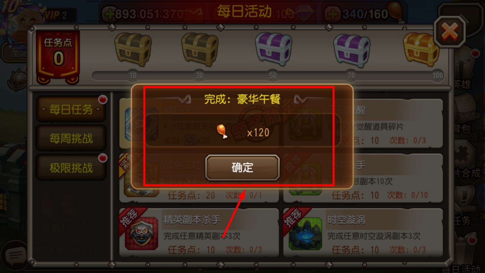 3、完成【豪华午餐】任务后,点击确定按钮,领取【鸡腿】×120的任务奖励。