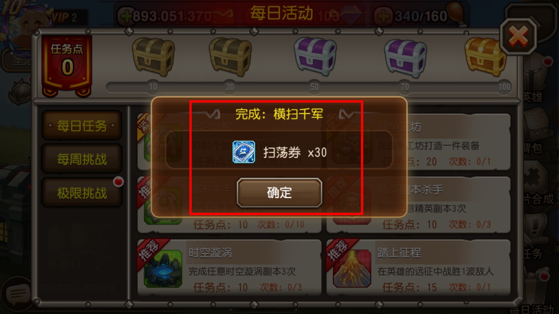 4、完成【横扫千军】任务后,点击确定按钮,领取【扫荡券】×30的任务奖励。
