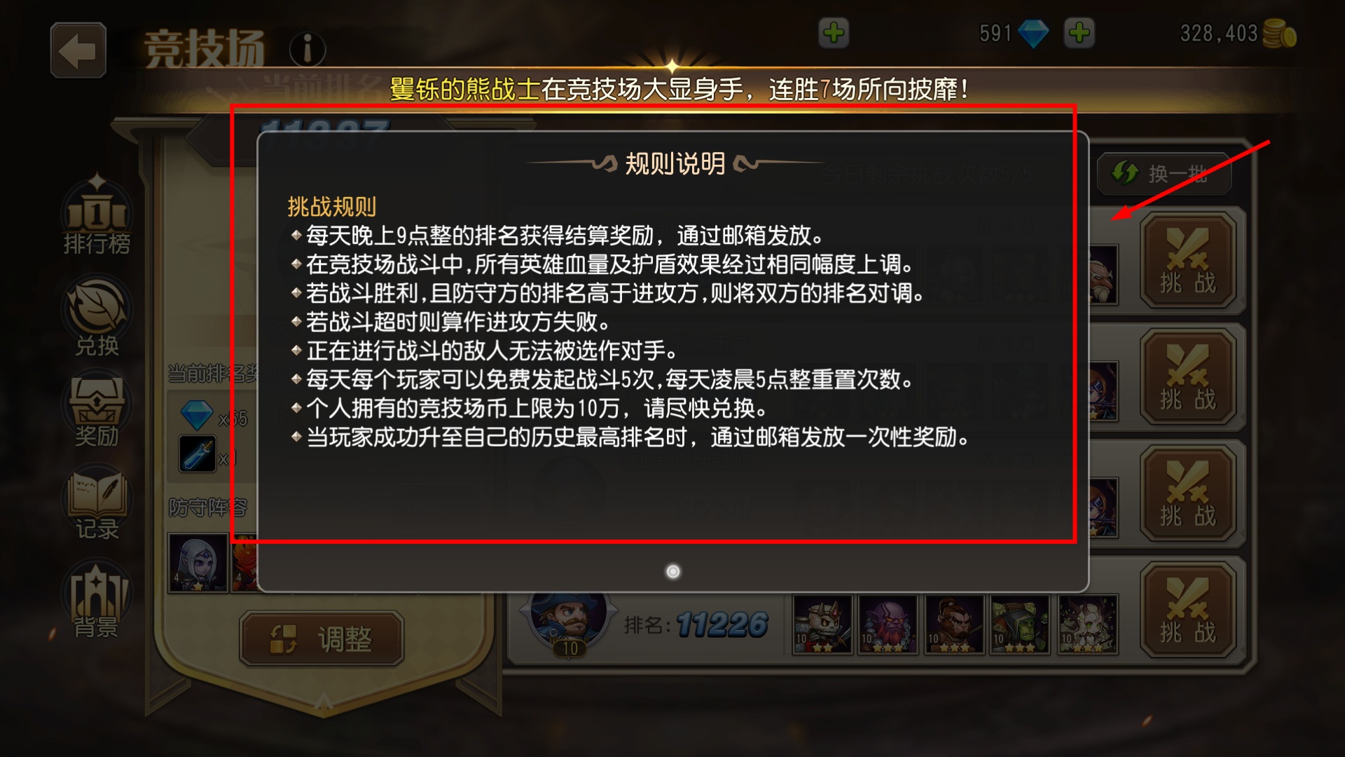 2、仔细查看竞技场规则,了解每日9点结算、战斗超时算失败等机制,能帮你更高效参与挑战。