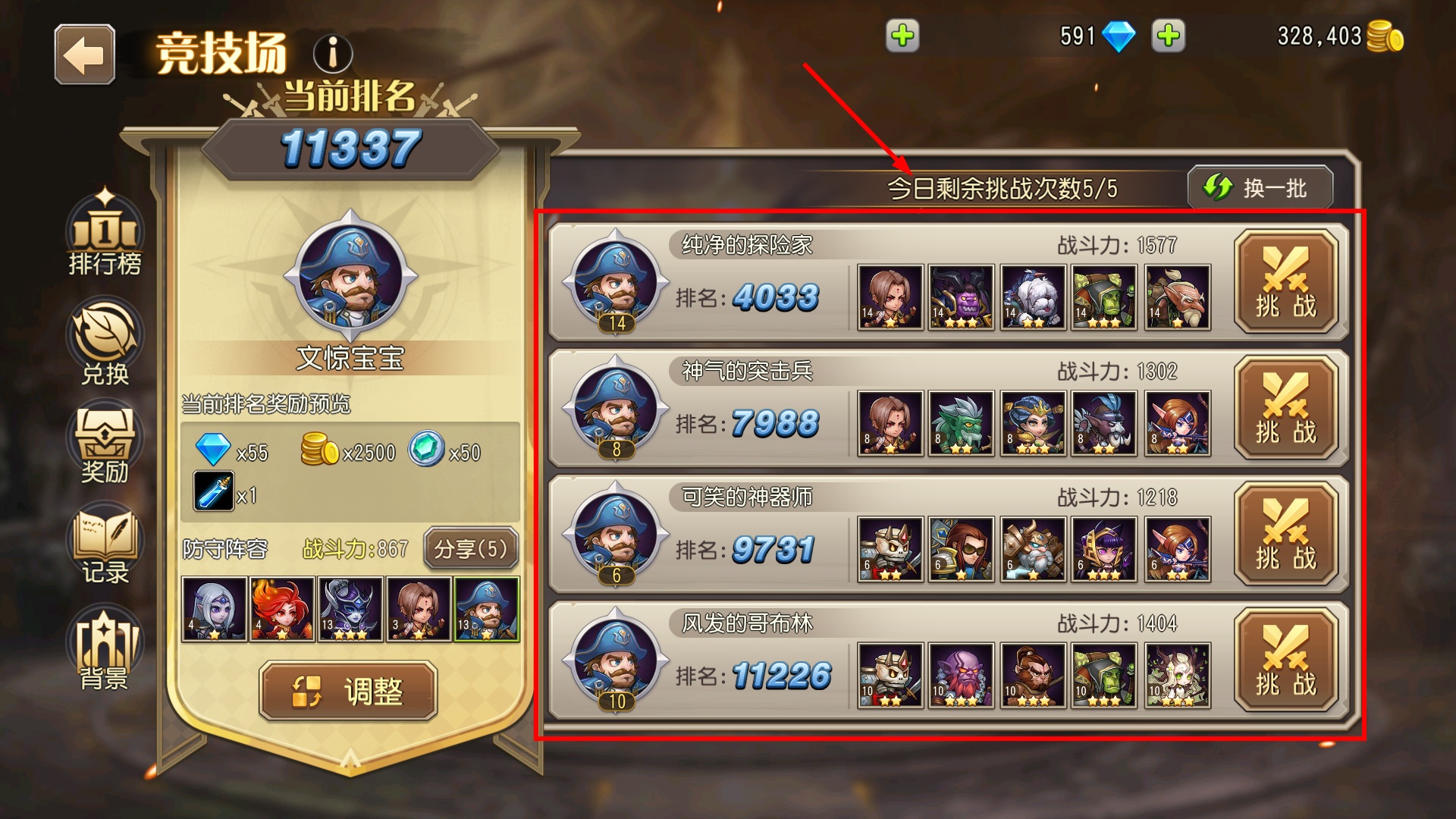 3、每日有5次挑战机会,优先选排名高于自己的对手,战胜后互换排名,快速提升竞技场名次。