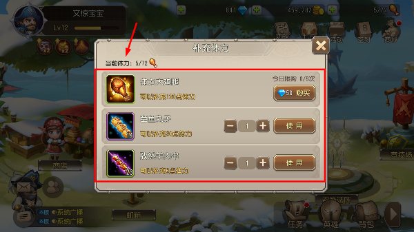 2、使用【体力药水】补充体力,或花费【50】【钻石】购买,确保有足够体力参与战斗和任务。