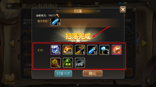4、扫荡完成后收取【金币】-【经验】-【装备】等奖励,确认后可再次扫荡提升资源获取效率。