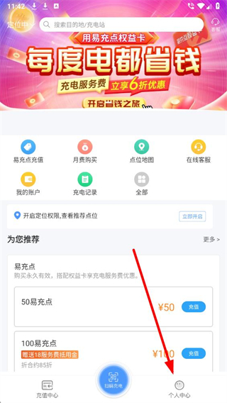 1、在E充站app首页,找到底部的个人中心选项并点击,进入个人页面。