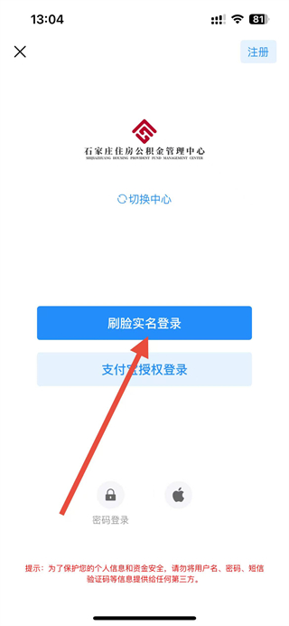 3、在登录选择界面中,点击刷脸实名登录选项,进入刷脸认证页面。