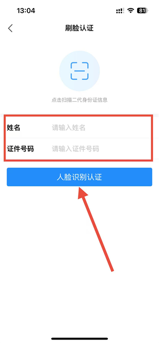 4、在刷脸认证页面,输入姓名和证件号码后,点击人脸识别认证按钮,完成人脸验证即可登录。