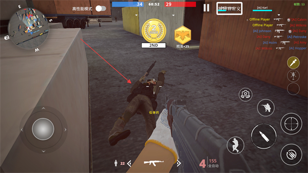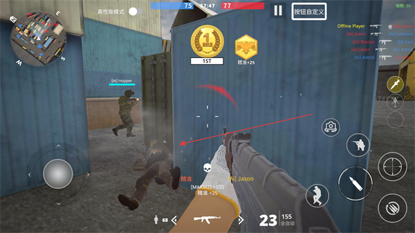 2、通过小地图观察敌方分布,优先攻击落单的敌人,逐步积累击杀数,避免同时面对多名敌人。