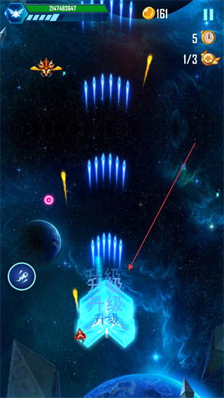 1、操控战机移动,点击升级强化弹幕输出,提升攻击范围与伤害,应对来袭的敌方单位。