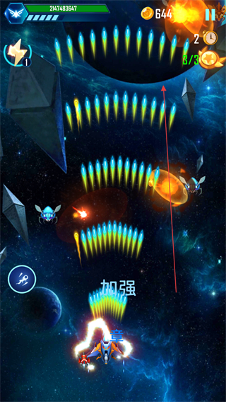 2、战机持续发射弹幕攻击敌方,击败后获取金币,消耗资源点击加强进一步提升战力。