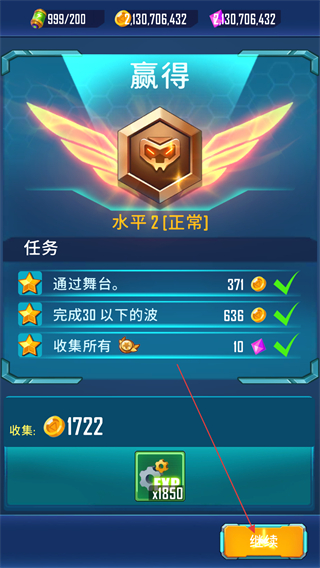 4、完成关卡后显示赢得水平2正常,查看任务奖励,点击继续进入下一关挑战。