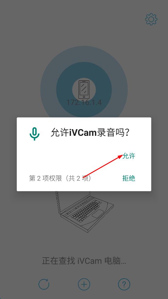 1、打开iVCam APP,弹出“允许iVCam录音吗?”的提示框,点击“允许”按钮,授予录音权限,继续后续操作。