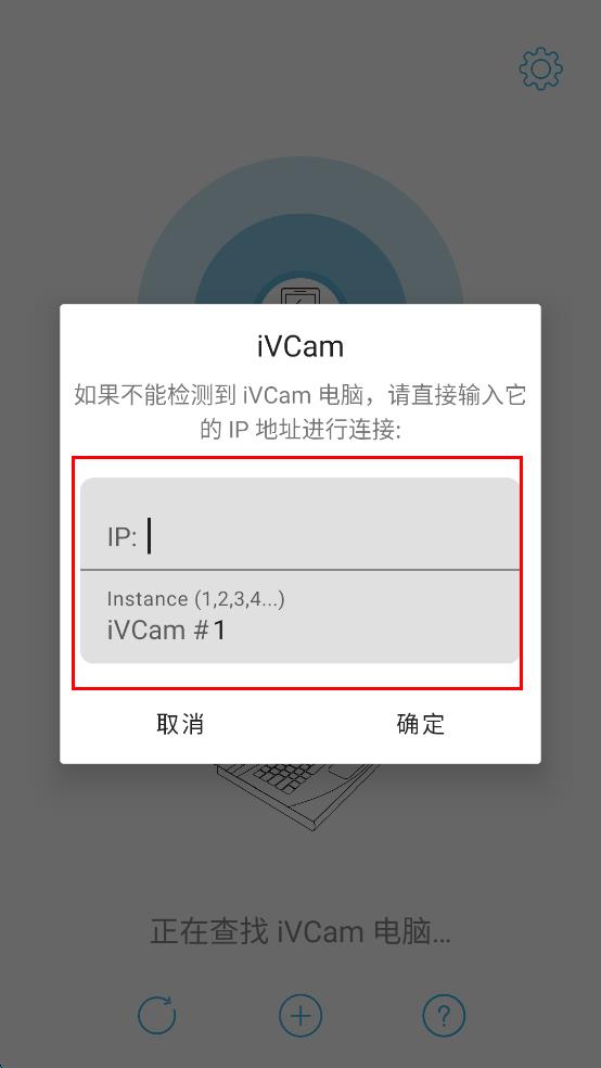 2、若APP不能检测到iVCam电脑,会弹出输入IP地址的窗口,在IP输入框中输入电脑的IP地址,然后点击“确定”按钮,尝试连接。