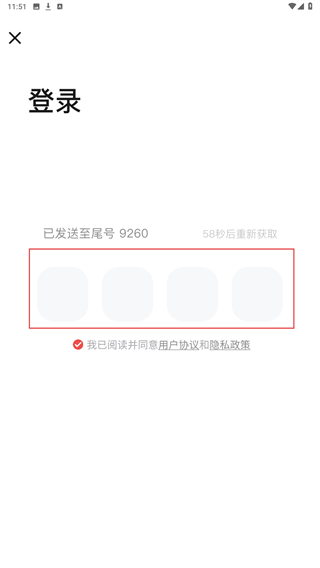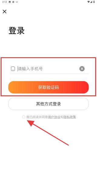 3、在登录页面输入手机号码,点击获取验证码,填写收到的验证码,并勾选我已阅读并同意用户协议和隐私政策,最后点击登录。