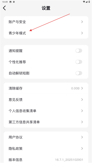3、在设置的页面内,找到并点击青少年模式。