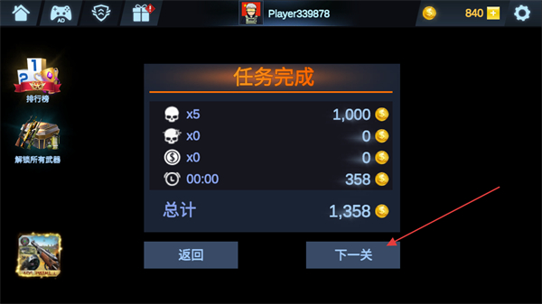 4、消灭所有敌人后,完成任务获取金币奖励,点击下一关继续挑战。