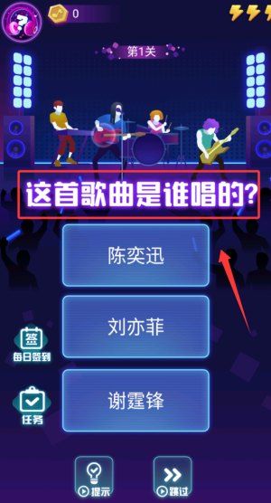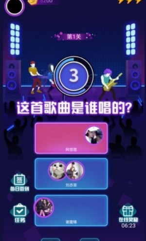 1、根据播放的歌曲片段猜测演唱者信息,答对后可累积积分并解锁更高级别曲库。