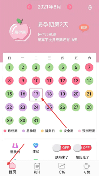 1、在首页日历界面,可直接查看标注的易孕期排卵期安全期等周期状态,同时显示当前处于易孕期的天数、距离下次月经的时长。