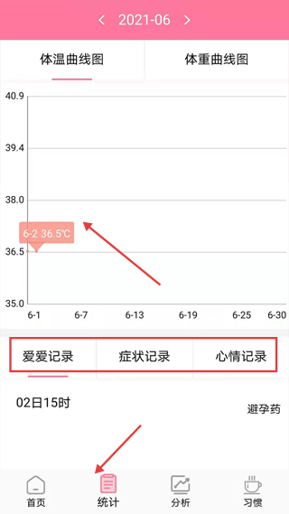 2、点击统计选项,能查看体温曲线图等数据,还可添加爱爱症状心情等记录,辅助周期判断。