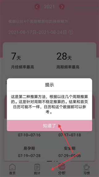 3、进入分析页面,系统会根据过往周期推算排卵期的日期范围,同时提示推算逻辑,结果可与首页日历结合参考。