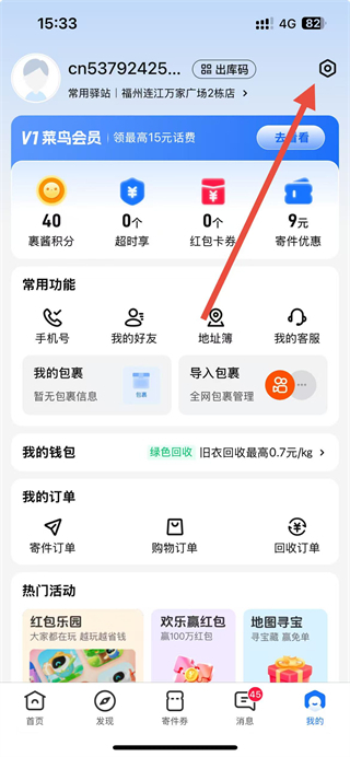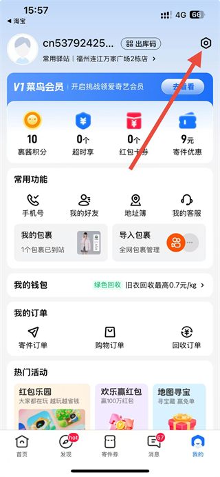 1、进入菜鸟裹裏app,在我的页面右上角找到设置图标并点击,进入设置界面。