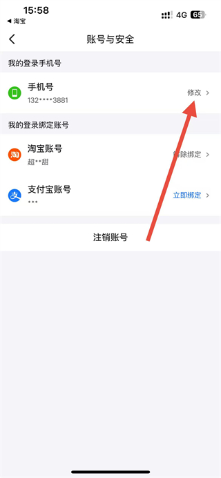 3、在账号与安全页面,找到淘宝账号栏,点击右侧解除绑定的按钮,按系统提示完成验证后即可解绑淘宝账号。