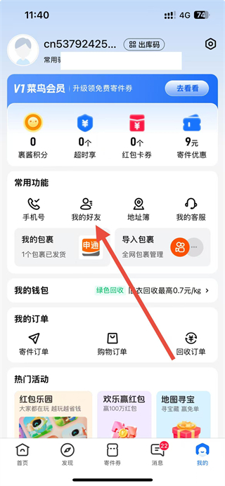 1、打开菜鸟裹裹APP,在我的页面点击我的好友选项。